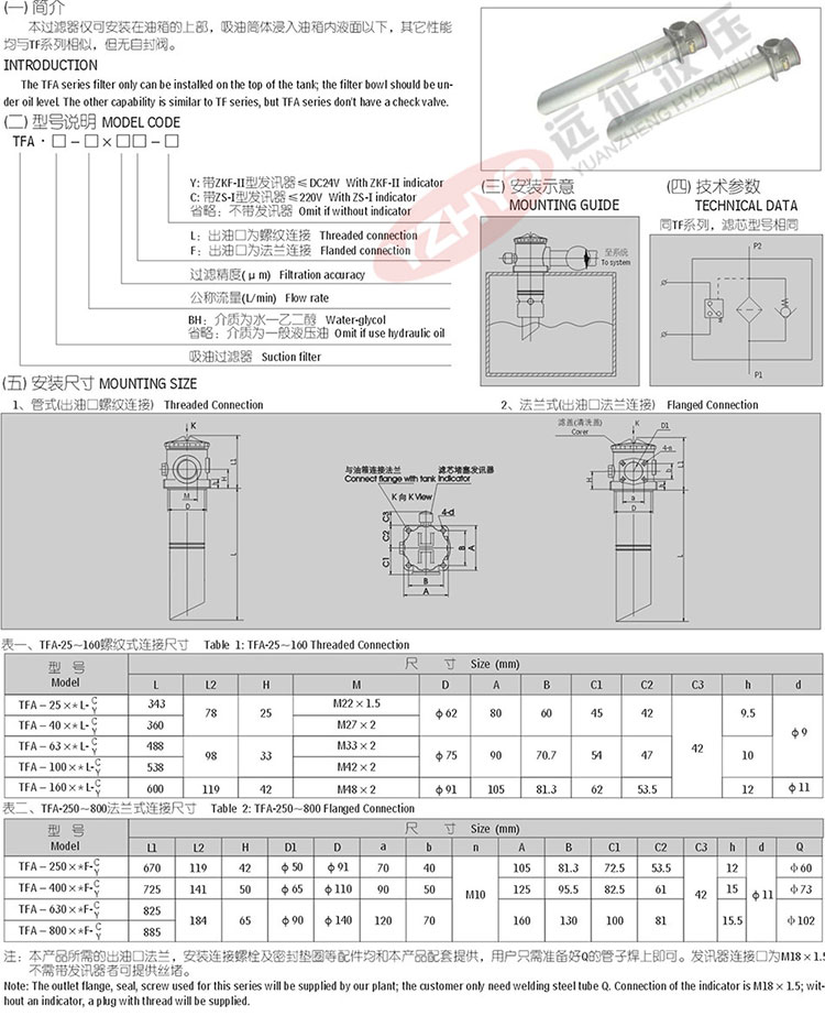 )的专 业厂家,长期以来为冶金、石油、矿山、工程、建筑、塑机、化工、机床、交通等行业的液压设备提供配套,同时为引进设备提供高品质的国产化备件。今天远征主讲TFA系列吸油过滤器(新型),详情请看下图: