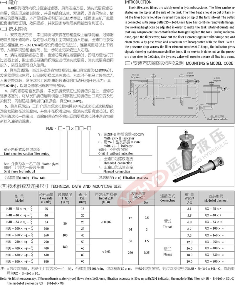 )的专 业厂家,长期以来为冶金、石油、矿山、工程、建筑、塑机、化工、机床、交通等行业的液压设备提供配套,同时为引进设备提供高品质的国产化备件。今天远征主讲NJU系列箱外内积式吸油过滤器,详情请看下图: